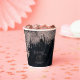 Optez pour un look éblouissant, éblouissant et glamour en utilisant les pièces de cette suite mariage comme indiqué, avec des bijoux en cascade des feuilles de palmiers incrustés de diamants ou supprimer les couches de bijoux pour un look un peu plus conservateur. Cet ensemble présente des feuilles en or rose chatoyant contre un arrière - plan bleu marine et texturé. La tasse en papier mariage montrée ici a une bordure de feuilles étincelants, un message personnel de "Merci" et les noms de la mariée et du marié et la date du mariage. Entrez facilement vos coordonnées en utilisant le modèle fourni. Affichez le lien de collection sur cette page pour voir tous les éléments correspondants dans ce bel ensemble ou recherchez ID830 pour voir d'autres options de couleur pour cette conception.