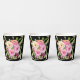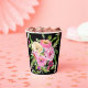 Le noir est la toile de fond dramatique pour cette impression florale rose féminine dans les tons rose, pêche et crème. Ces tasses en papier féminin seraient un bel ajout pour une douche nuptiale, une fête de jardin, une fête d'anniversaire ou un mariage extérieur.