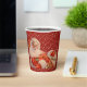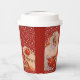Tasse en papier de vacances avec des flocons de neige blancs sur l'arrière - plan rouge et le Père Noël avec des cloches de traîneau.