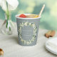 Elégantes tasses en papier personnalisées bleu-vert doux pour les célébrations mariages. Un design à double face, avec des neiges peintes à la main et des eucalyptus disposés en une belle couronne botanique. Tout le texte est entièrement modifiable de sorte que vous pouvez facilement modifier/supprimer le message sur un ou les deux côtés et modifier le style/la couleur/la taille de la police. Coordonner les éléments disponibles.