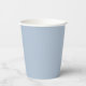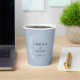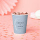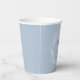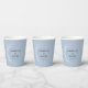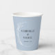 Cette conception de tasse en papier présente un graphique d'une couronne de feuilles blanches sur un arrière - plan bleu pâle et poussiéreux. Personnalisez avec les noms de la mariée et du marié et leur date de mariage.
