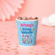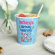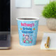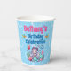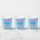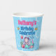 Adorable sous les gobelets de fête d'anniversaire de la mer avec une bonne sirène avec un sourire mignon et des joues roses roses. Elle a de longs cheveux blancs à fleur vive ornés de petites fleurs roses et bleues. Elle porte un chapeau en bikini en coquille rose et a une queue de poisson à écailles vertes. Elle est assise entourée de coquillages roses, bleus et verts et de corail bleu, rose et vert. Il y a une joyeuse étoile de mer rose et un poisson rayé bleu avec elle et les coeurs et les bulles qui flottent autour d'elle. Au-dessus de l'image se trouvent des modèles en bleu et en rose pour ajouter tous les détails de votre fête.