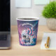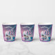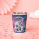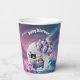 Une tasse en papier pour un baby shower à thème spatial décoré de ballons bleus et roses, adapté à tous les genres