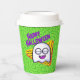 Decorate your spooktacular Halloween party with these party cups featuring a cute ghost character, bright green background, and retro 90's inspired design elements. Text includes the phrase "Happy Halloween" and "Boo!" to add an extra bit of Halloween flair. Perfect for any kid's Halloween party, birthday party, or fun event.