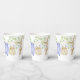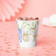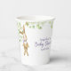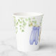 Tasse en papier pour baby shower, décorée avec de belles illustrations aquarelle de vêtements de bébé mignons accrochés sur une ligne à sécher, un mignon lapin farci entouré de branches délicates avec des feuilles vert clair.