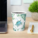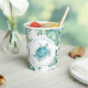 Ces tasses à baby shower fantaisiste sont ornées de tortues de mer tropicales d'aquarelle dans des tons bleu turquoise et de feuilles de palmiers tropicaux verts monstères. Utilisez les champs modèle pour ajouter votre texte personnalisé. Un joli choix pour les baby showers à thème de plage. L'aquarelle unique de Victoria Grigaliunas de Do Tell A Belle.