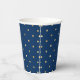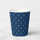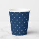 Tasses en papier pour fête à motif pois dorés. Faux pois en feuille d'or sur fond bleu marine.