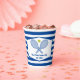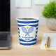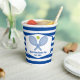 Ces élégantes tasses à papier du country club moderne comprennent des raquettes de tennis et une balle au-dessus de votre nom d'équipe de tennis et date établie. Décor rayé bleu et blanc pour vos joueurs de tennis et membres du country club.