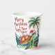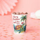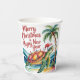 Une carte de voeux de Noël fantaisiste avec une aquarelle joyeuse illustrant une tortue de mer portant un chapeau de Père Noël festif et ornée de lumières scintillantes de Noël enfilées autour de sa coquille, posée sur fond de palmier balançant également éclairé par des lumières chaudes et un océan turquoise serein. La coquille de la tortue est peinte de motifs complexes de fleurs tropicales dans les tons pastel doux de corail, lavande et vert d'eau de mer, tandis que l'océan brille avec de subtils gradients de bleu et d'argent, créant une atmosphère paisible mais festive. "MERRY CHRISTMAS & HAPPY NEW YEAR" apparaît dans une police ludique et lettrée sur le dessus de la carte, avec l'intérieur offrant un espace blanc propre pour un message personnalisé et un motif subtil et répétitif de petits coquillages le long du bord inférieur pour renforcer le thème tropical. Le ton général est léger et joyeux, parfait pour envoyer des voeux chaleureux à des amis et à la famille pendant la période des fêtes.