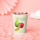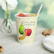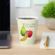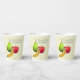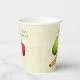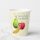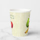 Yummy ! Ces tasses en papier cool sont ornées d'une peinture numérique originale de Leslie Sigal Javorek, retro-stylisée, avec un trio d'"autocollants" de fruits dressé contre une nappe en vinyle couleur coquille d'oeuf et la légende "All Life is a Picnic to be Joyed !"