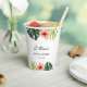 Gobelets en papier classiques pour enterrement de vie de jeune fille ornés de motifs tropicaux à l'aquarelle : feuille de monstera, feuille de palmier et fleur d'hibiscus. Personnalisez les gobelets avec vos détails pour le jour de votre fête. C'est simple et le résultat est immédiatement visible sur l'écran.
