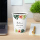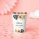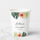 Gobelets en papier classiques pour lavage de bride ornés de motifs tropicaux aquarelles : feuille de monstera, feuille de palmier et fleur d'hibiscus. Personnalisez les gobelets avec vos détails pour votre jour de fête. C'est simple et le résultat est immédiatement visible sur l'écran.
