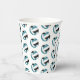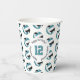 Ces tasses de papier de fête d'anniversaire sur le thème du volley-ball comportent plusieurs petites boules de volley turquoises, noires et blanches disposées en un simple motif - le texte sur un graphique en cercle blanc peut être customisé, actuellement le numéro 12 pour représenter l'âge d'un enfant encerclé par les mots "Joyeux anniversaire" - par katz_d_zynes