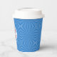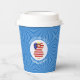 Des tasses en papier avec couvercle pour votre fête Hanoukka ont un ange aux cheveux rouges portant le drapeau des Etats-Unis d'Amérique pour la décoration ou la décoration de vacances. L'ange du drapeau américain se trouve à l'intérieur d'un cercle blanc de carrés grossiers. L'arrière - plan est une fractale bleue de carrés grossiers. Ajoutez votre propre texte ou personnalisez avec un nom et l'année.