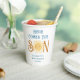 Ces tasses en papier baby shower sont ornées du texte "Here Comes The Son" en typographie rétro bleue avec un joli soleil d'aquarelle jaune. Facile à personnaliser. Parce que nous créons notre oeuvre, vous ne trouverez pas cette image exacte d'autres designers. Aquarelle originale © Michele Davies.