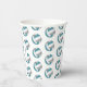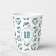 Ces tasses de papier de fête d'anniversaire sur le thème du volley-ball comportent plusieurs petites boules de volley turquoises, grises et blanches disposées en simple motif à goutte - le texte sur un graphique en cercle blanc peut être customisé, actuellement le numéro 12 pour représenter l'âge d'un enfant encerclé par les mots "Joyeux anniversaire" - par katz_d_zynes