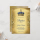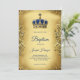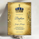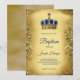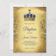 Gold baptism invitation with an ornate design, featuring a blue crown at the top. Elegant script text conveys a formal and celebratory tone.