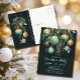 Elegant Christmas holiday party invitation postcards feature pine branches, green and gold Christmas ball ornaments and ribbons on a dark green background with your details in chic lettering, with room for your guest's address on the back, perfect for your festive holiday gathering. MATCHING items in our collection.