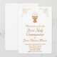 Celebrate this sacred milestone with a timeless First Holy Communion invitation featuring classic Catholic symbolism and elegant gold accents. This refined design showcases a traditional chalice and host, soft decorative ribbons, and beautifully balanced typography, creating a meaningful and reverent announcement for family and friends.