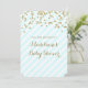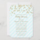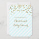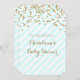 Invitations de douche bébé personnalisées avec motif confetti d'or et pastel clair bleu ciel et blanc rayures avec lettrage de style manuscrit. Personnalisable avec votre texte.
