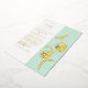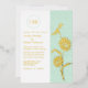 Élégant faire-part de mariage en feuille d'or réalisé en arrière - plan mi-blanc et mi-vert menthe, avec marguerites en feuille d'or, sur le côté droit vert. Personnalisez le texte du feuillet pour répondre à vos besoins mariages.