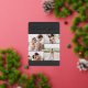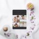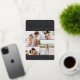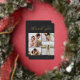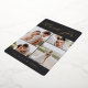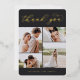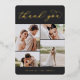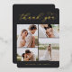 Elégante carte de remerciement de mariage comprend quatre photos disposées dans un montage de grille sur un riche arrière - plan noir de charbon de bois. "Merci" apparaît en haut dans le script de calligraphie de feuille d'or chic, avec vos noms en bas dans le lettrage de bloc classique. Ajoutez un message personnel et une signature à l'arrière.