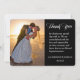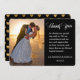 Votre photo est située sur le côté gauche de ce carte de remerciements mariage horizontal modèle photo. Le côté droit a le texte "Merci" écrit dans un joli script en blanc, suivi de votre propre message spécial. Votre signature personnalisée et votre date de mariage se trouvent en bas à droite. Le dos de l'invitation est noir dramatique avec un joli motif de coeurs d'or. Moderne, très personnel et tendance !