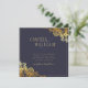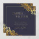 Présentez nos invitations de mariage à l'allure de dentelle d'or avec un arrière - plan bleu marine foncé frappant! Ces invitations sont parfaites pour les couples qui veulent ajouter une touche de luxe et d'élégance à leur journée de mariage. Le design complexe en dentelle d'or à l'allure de papier s'oppose à l'arrière - plan bleu marine foncé, créant un effet sophistiqué et spectaculaire. Ces invitations sont parfaites pour les mariages de cravates noires ou formelles, ainsi que pour les mariages modernes avec une touche de glamour. La technique d'impression à plat permet à vos invités de comprendre facilement les détails de votre journée spéciale en lisant le texte de manière claire et simple. Les invitations sont entièrement personnalisables, de sorte que vous pouvez modifier le texte, la police et la couleur pour correspondre à votre thème et à votre style mariage. Nos invitations de mariage en dentelle d'or contre un arrière - plan bleu marine foncé laisseront une impression durable sur vos invités. Elles sont parfaites pour les couples qui veulent une invitation intemporelle et luxueuse qui donne le ton pour leur jour de mariage.