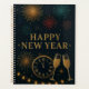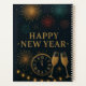 Celebrate the New Year with this elegant black-and-gold design featuring sparkling fireworks, a classic midnight clock, and shimmering champagne glasses.