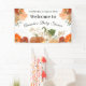 Bienvenue aux invités au baby shower avec cette bannière. Le design est orné de citrouilles orange et blancs agrémentés de touches de feuilles d'or. Le design comprend également des fleurs automnales autour des bords. Le texte peut être personnalisé pour inclure le nom de la mère. Le reste du texte de conception peut être conservé tel quel, modifié ou supprimé.