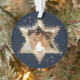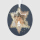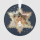 Élégante star Hanoukka de David photo Hanoukka ornement. Des étoiles dorées brillantes créent l'étoile de David avec un espace réservé photo placé dans l'étoile de David. L'envers est orné d'un élégant faux arrière - plan doré avec les mots "Notre premier Hanoukka comme". Customisez avec votre nom. Oeuvre de Moodthology Papery.