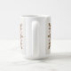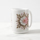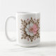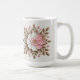 This mug features a decorative floral mandala design with a white background. The centerpiece features a large white and pink flower with gold leaves and gold centers. The leaves are in a symmetrical pattern radiating outward. Small pink flower buds are throughout the design, connected by thin tan stems. The leaves are detailed with visible veins and a glossy texture. The mug is a white classic mug. The mug is a fifteen ounce mug. The mug is microwave and dishwasher safe.