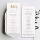 Quelques croquis d'arbres d'hiver surmontés d'étoiles (Noël, ou simplement vacances), en numériquement dorés, décorent ce programme de cérémonie mariage élégant, noir et blanc et or, simple, classe et moderne, parfait pour un mariage d'hiver, autour ou à Noël ou à tout moment pendant les vacances. Il dispose de calligraphie script moderne et élégante avec des amplis florissants. Luxueux mais simple, classique mais chic, moderne mais intemporel. Un très beau choix pour un couple qui se marie dans les mois froids de novembre, décembre et janvier et qui aime l'esthétique de l'art noir et blanc pour la papeterie mariage, noir et blanc et feuille, l'élégance botanique et les arbres d'hiver.