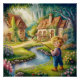 Cette peinture sereine capture un village pittoresque niché au coeur d'une forêt luxuriante, avec un ruisseau serpentant à travers des fleurs et des jardins animés. Au premier plan, un gentil garçon aux cheveux dorés tousled tient un poteau de pêche, en regardant le ruisseau. La lumière du soleil filtre à travers les arbres, projetant une lumière chaude et évoquant un sentiment de nostalgie et de tranquillité.