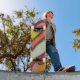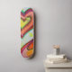 Détail de peinture de deux coeurs de la peinture "Laugh". Les coeurs sont jaune, orange, pêche, rose, magenta et rouge. Le support est aquarelle avec parties scintillant en verre.