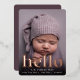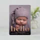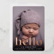 Les cartes à faire-part de naissance fraîches et modernes sont dotées d'une photo à fond saigné vertical ou à orientation portrait avec "bonjour" superposé sur le fond en papier doré rose. Personnalisez avec le nom du bébé et les statistiques de naissance, et ajoutez une photo supplémentaire au dos, ainsi qu'un message personnel.
