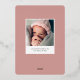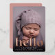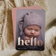 Les cartes à faire-part de naissance fraîches et modernes sont dotées d'une photo à fond saigné vertical ou à orientation portrait avec "bonjour" superposé sur le fond en papier doré rose. Personnalisez avec le nom du bébé et les statistiques de naissance, et ajoutez une photo supplémentaire au dos, ainsi qu'un message personnel.