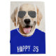 Golden Retriever chien avec t-shirt bleu et lunettes de soleil d'aviateur pour 35ème anniversaire. L'âge d'anniversaire est modifiable. Arrière - plan peut être modifié.