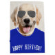 Golden Retriever chien avec t-shirt bleu et lunettes de soleil d'aviateur pour l'anniversaire. Le texte est modifiable. Arrière - plan peut être modifié.