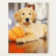 Un chiot de 12 semaines du Golden Retriever repose avec un jouet de basket-ball en peluche entre ses pattes dans la maison de son propriétaire.
