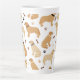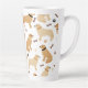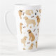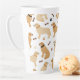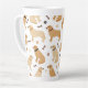 Cute Golden Retriever dogs with dark and light coats sit and stand with scattered dog bones and pawprints on a white background.