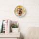 Un portrait d'un beau chien d'or rétriever est la caractéristique de cette horloge. L'image est placée sur un arrière - plan de coucher de soleil rayé rétro, légèrement en détresse. Les chiffres en or foncé et les marqueurs en forme de diamant autour du périmètre rendent l'horloge facile à lire. Parfait pour tous ceux qui ont perdu leur coeur au profit d'un Golden.