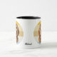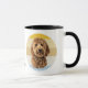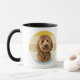 Un portrait d'un magnifique chien Goldendoodle est la caractéristique de cette tasse. L'image est placée sur un arrière - plan de coucher de soleil rétro, légèrement déprimé, doré, bronzé et bleu rayé, et imprimée deux fois sur la tasse. Votre nom est en script noir entre les images.