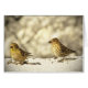 This note card features a Pine Siskin who seems to be talking to a male goldfinch although he has a sunflower seed in his mouth! They are standing in the snow on a sunny winter day illuminated by a golden light. A smaller image is inside on a pale yellow gradient.