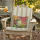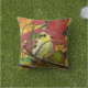 Ce coussin de plein air présente une charmante petite finche dorée perchée sur une branche, entourée d'un superbe feuillage d'automne. Il est aussi petit que les feuilles du frêne et se fond en fait pour former une composition abstraite de rouge, orange, vert, jaune, noir et blanc. L'image est répétée à l'arrière.