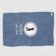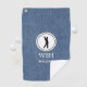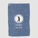 Silhouette noire de l'homme golfeur dans un cadre rond blanc avec initiales et nom, sur un bleu clair denim imprimé serviette de golf. Personnalisez les initiales et le nom pour créer un cadeau de golf unique et garder saké. Vous pouvez inverser les initiales en un nom plus grand et supprimer le nom plus petit. Utilisez le Modèle simple fourni pour modifier le texte et le rendre vôtre. Dimensions : 16" x 24", 80% tissé polyester/20% polyamide mélangé microfibre, hameçon grommet et laiton inclus. Lavable en machine.