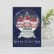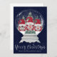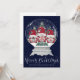 Trois mignons génomes se tiennent sur une scène forestière dans un globe de neige. Ils ont sur des chapeaux de Père Noël rouge et chacun a un cadeau. Il y a des pins derrière eux et un buisson vert devant. Joyeux Noël est écrit ci-dessous dans un script populaire de calligraphie à la mode. Vous pouvez ajouter votre nom ou un salut de vacances supplémentaire ci-dessous. Toute la scène est habillée de neige légère. Tout s'affiche sur l'arrière - plan bleu foncé.
