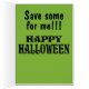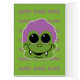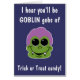 Le gobelin souriant adorable a la peau verte, les cheveux violets funky, les crocs et de grands yeux sucrés. Page d'accueil : Face Gobelin avec un texte : J'entends que vous serez GOBLIN Gobs of Trick ou Treat Candy. Hébergement intérieur : face de gobelin sur arrière - plan à motif de nom nom nom. Message intérieur : Sauvez-en pour moi ! ! ! Joyeux Halloween ! C'est une carte amusante pour vos hanteuses d'Halloween préférées !
