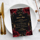 Elevate your reception tables with this Dark Romance Gothic Wedding Menu, featuring a rich black background, refined vintage-inspired details, rich roses, elegant gold frame and elements. Perfect for candlelit receptions, castle venues, and black tie gothic weddings.