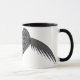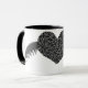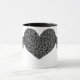 Cette tasse présente un joli coeur noir gothique avec l'apparence de dentelle fine. Le coeur est flanqué sur les deux côtés avec des ailes argentées métalliques brillantes. Le design est montré sur une tasse à café noir et blanc style rond, mais est également disponible sur de nombreux autres styles et couleurs de tasses.